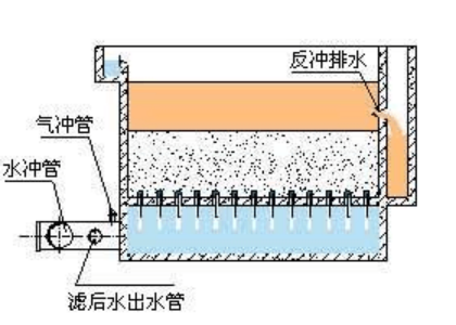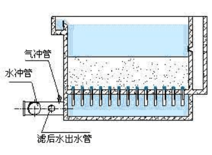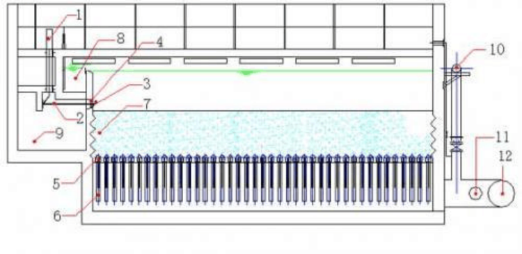 9. 反冲排水渠道;10. 反冲气管;11. 滤后水出水管;12. 反冲水管