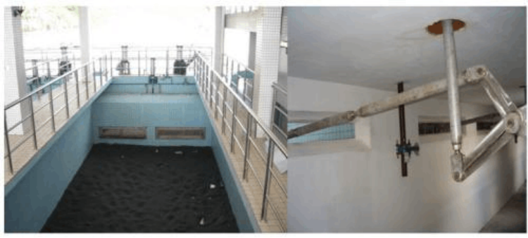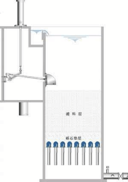 翻板滤池是瑞士苏尔寿(Sulzer)公司采用的一种滤池布置形式。由于该滤池在反冲洗排水时排水阀在0-90°之间翻转,故被称为翻板滤池。其结构简图如下: