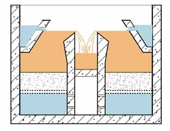 反冲洗过程:关闭进水阀,进水阀两侧的两个过水窗依然处于常开状态,通过V型槽底部的配水孔,形成表面漂洗。然后开启排水阀将池面水从排水槽中排出直至滤池水面与V型槽顶相平。开始进行反洗操作,采用“气冲-气水同时反冲-水冲”三步: